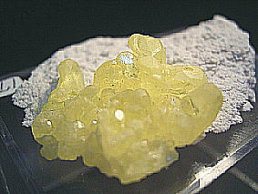 硫黄 メキシコ産 ←4.5cm→ こちらは、肉眼でもはっきり分かる大きめの結晶が 母岩にいくつもついたもの^_^ 標本ラベルと一緒に 「もろいので注意」と書かれた紙も入ってました 以来十年・・・そそっかしいσ(^^)にしては ついうっかりと壊すこともなく 今回の撮影も無事乗り切ったのでちょっとほっ^_^ せっかくの地球の贈り物 大切に扱ってあげないと・・・っすよね^_^>ALL